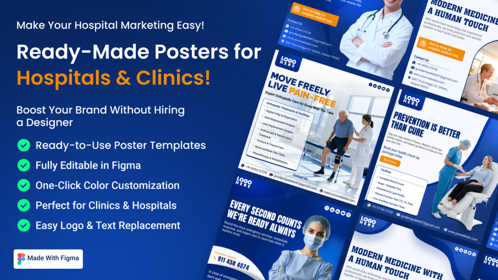 This pack includes 5 editable poster templates in both Figma and PSD format, perfect for healthcare marketing, print, and social media promotions.